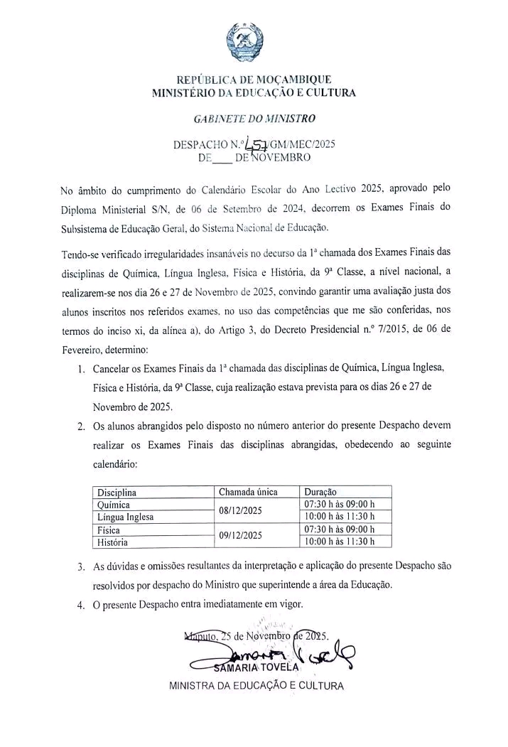 Com a repetição dos exames e o curto intervalo para a nova chamada, o Ministério promete reforçar mecanismos de controlo para assegurar que as provas de Dezembro decorram com transparência e máxima segurança. Curiosamente, o Despacho ministerial não faz qualquer referência à prova de Matemática, apesar de ter sido precisamente essa a primeira a vazar nas redes sociais na manhã de terça-feira, desencadeando a onda de suspeitas que precipitou o cancelamento nacional. A ministra Samaria Tovela limitou-se a mencionar apenas as disciplinas de Química, Língua Inglesa, Física e História, deixando de fora a prova cuja circulação antecipada havia sido amplamente denunciada por alunos e professores em várias províncias Redacção