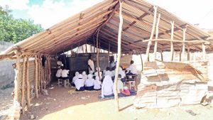 Alunos assistem aulas em sala improvisada na Escola Básica de Inguri, em Angoche, enfrentando condições precárias de aprendizagem.